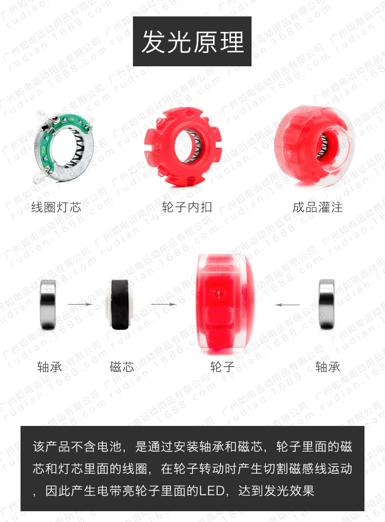 This product does not contain batteries. It is achieved by installing bearings and magnetic cores, as well as the magnetic cores inside the wheels and coils inside the lamp cores. When the wheels rotate, it generates a cutting magnetic induction line movement, resulting in an electric belt that illuminates the LED inside the wheels, achieving a luminous effect.