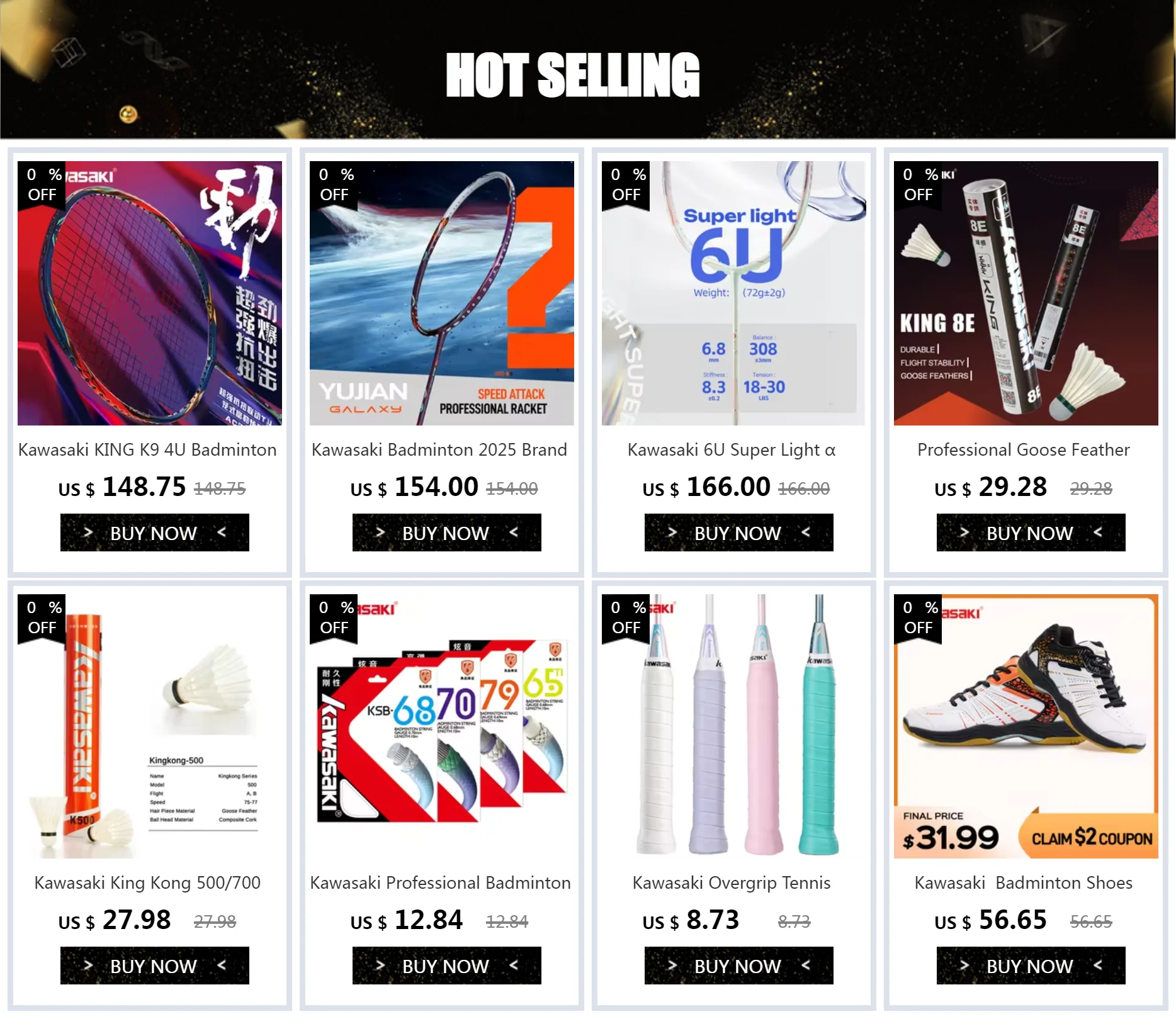 1. Badminton Racket*1 piece (without strung) or  Badminton Racket*1 piece (get strung by Kawasaki string)