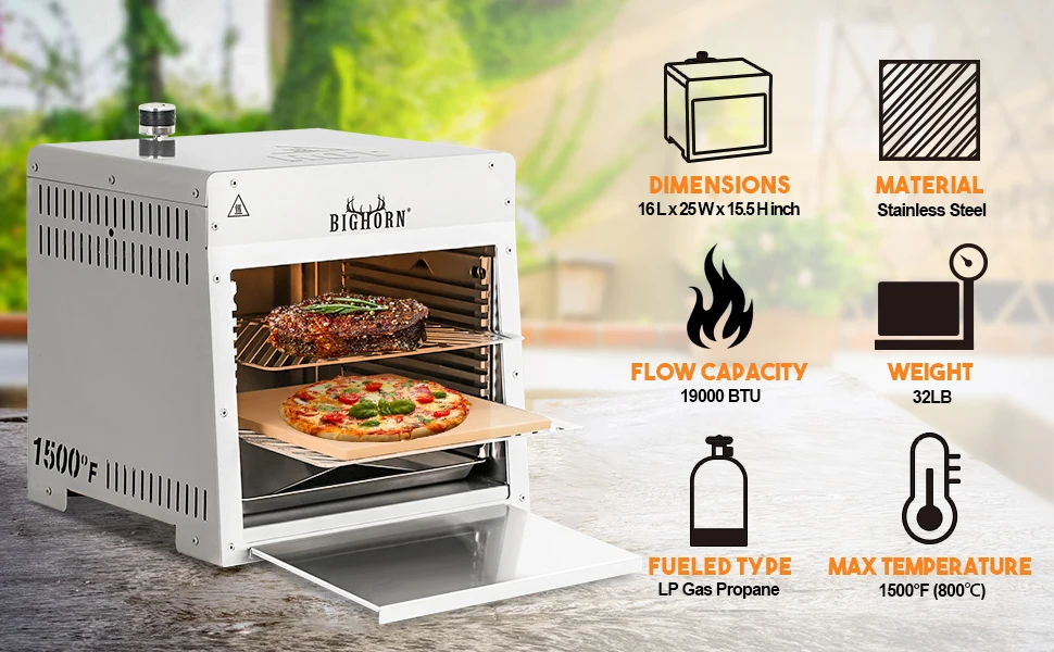 Intense heating to 1500℉ in minutes with the infrared burner inside the steak grill, for best steak cooking temperature and let you load up your favorite meats, vegetables, burgers, salmon, pizza, lamp chops, chicken breast and snacks, providing the ultimate barbecue experience for you.