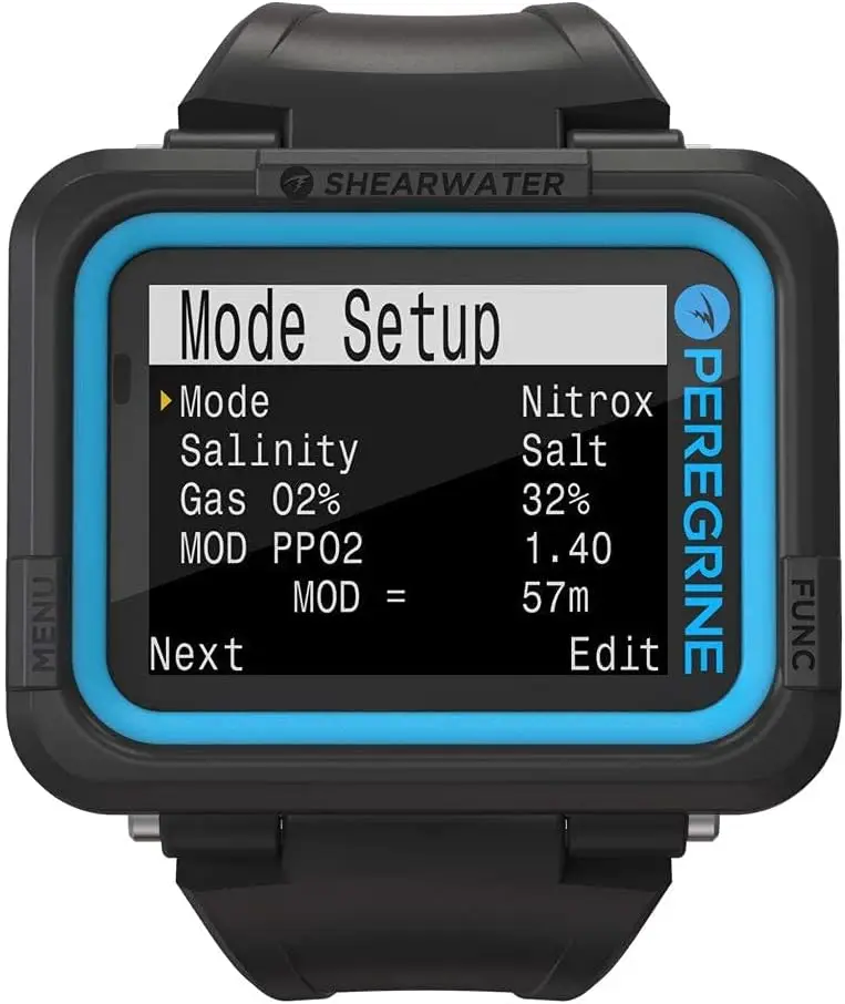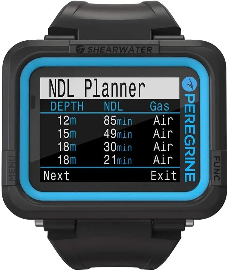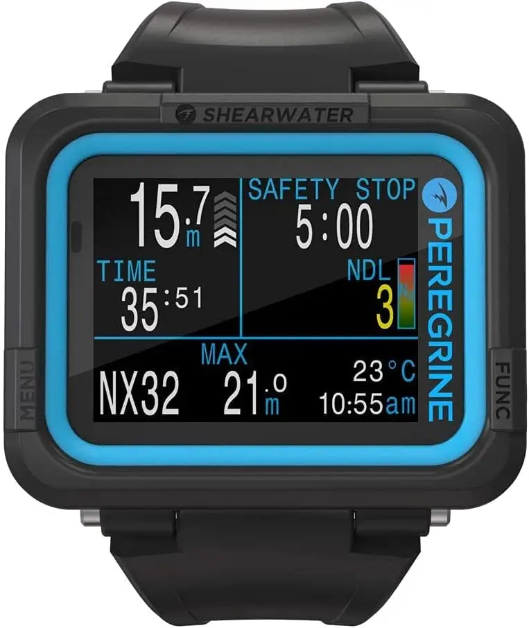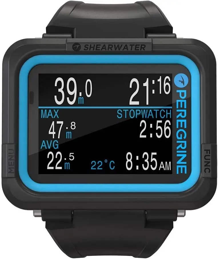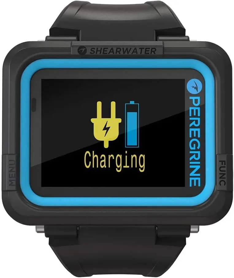 Embark on your adventure into diving with Shearwater. The Peregrine is a simple and easily accessible, full colour, multi-gas dive computer. With the Peregrine we simplified operations and made a computer that is easy to use for divers of all experience levels. The Peregrine is your ideal companion for many adventures to come. Multi Diving Modes There are 4 diving modes: Air (For recreational diving) Nitrox (Single gas up to 40%) 3 Gas Nitrox (Up to 100% O2) Gauge (Depth, time, resettable stop watch function) Simple and Powerful The Peregrine has a full colour 5.59 cm LED LCD screen with vivid, enhanced colour range and saturation display. It has simplified recreational diving modes with full decompression support. The diver can easily navigate and customize important diving information displayed on the home screen. Shearwater dive computers never lockout for dive plan deviations. The Peregrine is best suited for Air and Nitrox divers that want a great screen at an exceptional value with a simplified feature set. User Customizable Display – Customize your display with information important to you. Wireless Charging – Battery life per charge is up to 30 hours on medium brightness level. USB wireless charging station is included. Multiple Languages – Languages include: English, French, Simplified Chinese, Traditional Chinese, German, Portuguese, Korean, Japanese, Italian, Italian and Spanish. In the Dive Log menu, a diver can quickly view detailed graphs and dive information such as a dive log list, water temperature changes, depth, start and end time, surface interval time and more, all easily available at the diver’s fingertips. The Peregrine has a quick NDL planner and intuitive DECO planner that divers can use to plan their dives. The decompression algorithm that Shearwater uses is the Buhlmann GF algorithm. Cloud Control Divers can easily link their Peregrine dive computer via a bluetooth connection, allowing them to share information easily.